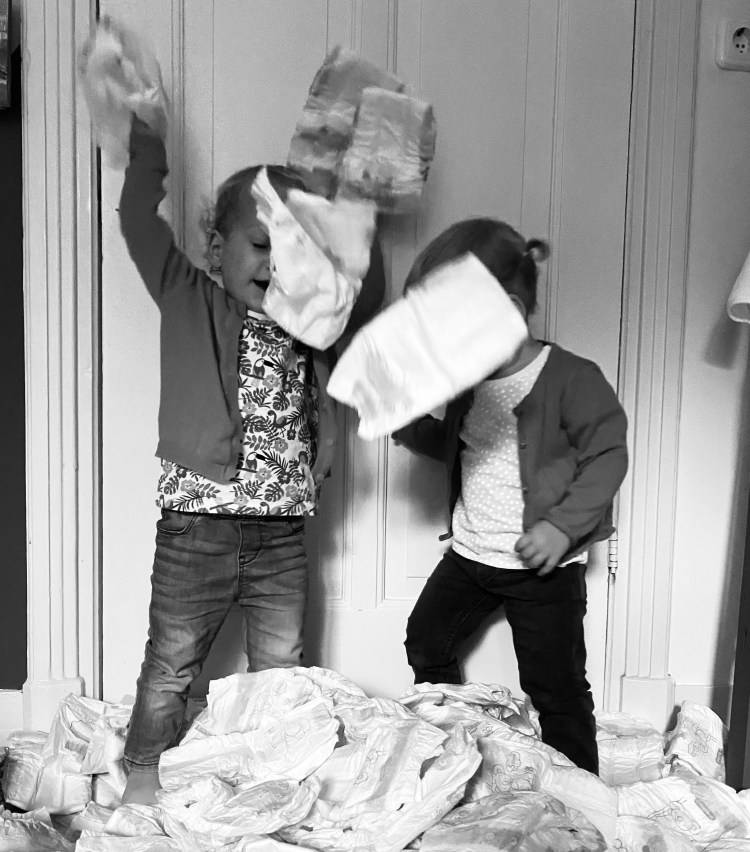Zus 1 zit op de wc met bril-verkleiner. Ze begint te klappen, dat is vaak een goed teken: POEP. Ondertussen staat zus 2 voor zus 1 te drentelen want je raadt het al: er moet door een ander gepoept worden. Dus hup, zus 1 van de wc af om zus 2 er op te zetten. Zus 2 heeft iets meer moeite met ontspannen dus doet iets langer over haar productie. Ondertussen staat zus 1 weer te hupsen voor de wc. Dat is geen goed teken kan ik je vertellen. ‘Moet je plassen meid?’ vraag ik haar. Er wordt wild geknikt. Als zus 1 moet plassen, moet zus 1 ook écht plassen. Dus volgt het lot van een tweeling; ‘Sorry zus 2, je moet van de wc af je zus moet er weer op.’