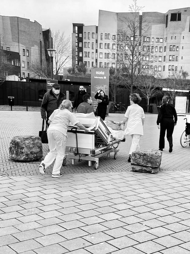 Sjoerd pakt zijn rol als ambulancebroeder. Hij zet de verwarming aan op standje sambal. Die warmte zal Jessi fijn vinden. Ondertussen proberen we de auto een beetje schoon te maken en helpen we Anna wat comfortabeler te zitten met Jessi tegen zich aan in de stoel. Sjoerd gaat achter het stuur zitten en rijdt voorzichtig naar de ingang van het ziekenhuis waar het lege ziekenhuisbed als een vreemd obstakel op de stoep staat. Wij lopen erachteraan richting de ingang van het ziekenhuis. Met zijn allen helpen we vervolgens Anna en Jessi vanuit de auto op het bed te krijgen. Ik zie de ziekenhuisbezoekers kijken. Anna lijkt net een Koningin op haar troon, met haar lieve meisje tegen zich aan. Wat een powervrouw. Terwijl het ziekenhuisbed langzaam in beweging komt, lijkt er, hoe bizar, wat sneeuw uit de lucht te dwarrelen. Het kan niet nog specialer worden op deze 7 april van 2021.