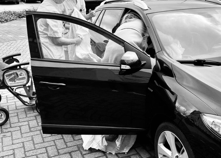 Ik sprint uit mijn auto en speur over de parkeerplaats. De verloskundige en verpleegkundige van het ziekenhuis staan vlak voor de ingang. Ook zij kijken de parkeerplaats over op zoek naar iemand die mogelijk gaat baren. Ineens zie ik Sjoerd bij hun auto staan, de deur van de bijrijdersstoel staat open, ik vang een glimp op van een bloot been en ren richting de auto. Hij zwaait driftig zijn armen boven zijn hoofd en ik hoor hem: ‘HIER, HIER,’ schreeuwen. Ik draai me om naar de verloskundige van het ziekenhuis maar ook zij hebben Sjoerd al gezien en komen achter mij aan. Ze laten het bed staan en nemen de spullen die erop liggen mee.