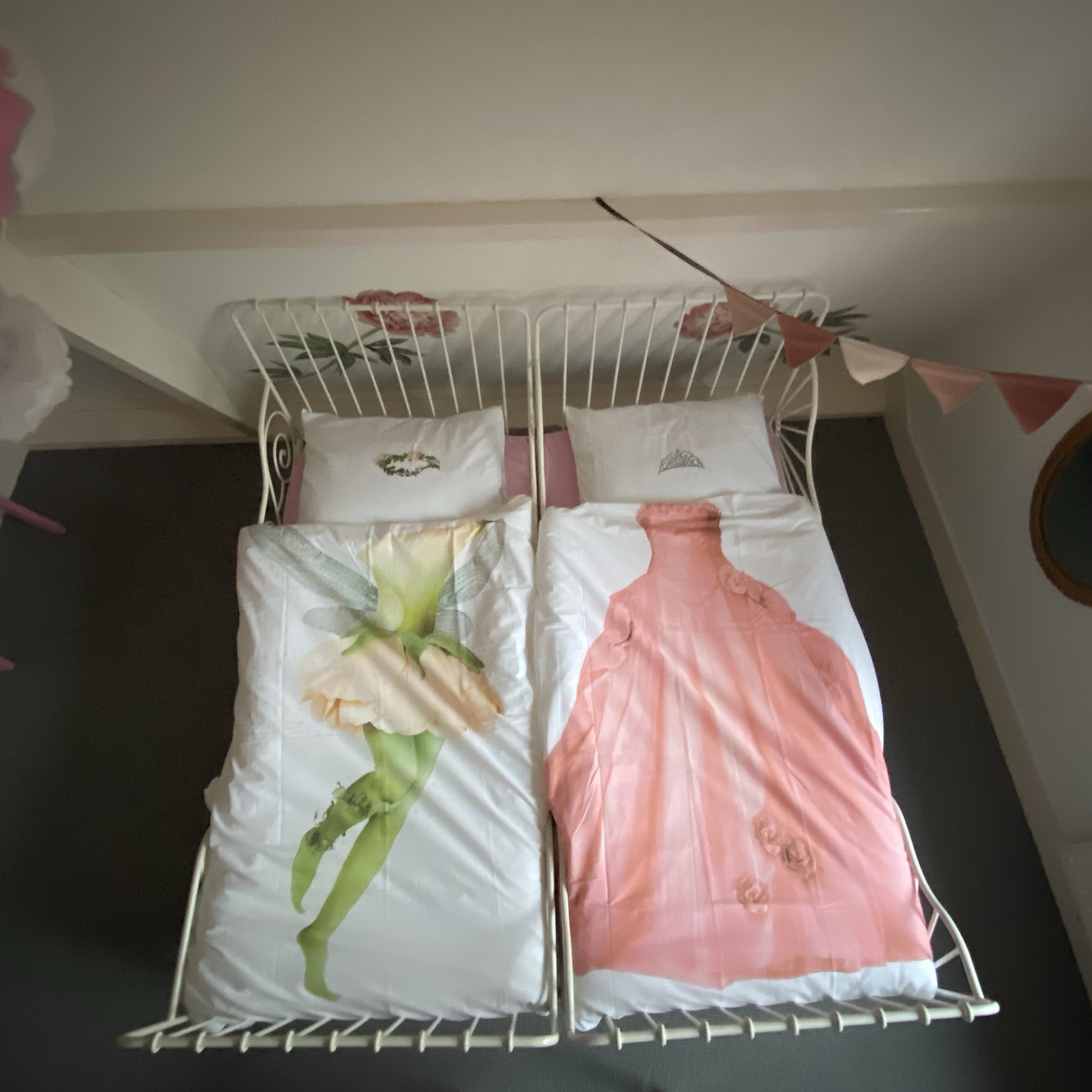 Gelukkig hoort die zus de overeenkomst niet. Ze is blij voor haar wederhelft en herkent de droom niet als zijnde haar eigen. Ik laat ze in hun waan. En ben stiekem jaloers op hun ontoereikende plafond. Misschien heeft dat dekbed echt een soort toverkracht? Ik kijk nieuwsgierig op de site van SNURK en zie dat ze zowaar ook een lits-jumeaux variant hebben van deze prinsessen. Daar zit helaas de prinsessen print maar aan één kant. Ik stop hem toch in mijn winkelmandje. Hopelijk wordt mijn man niet jaloers op de dromen over elfjes en prinsessen. En anders ruilen we een nachtje.